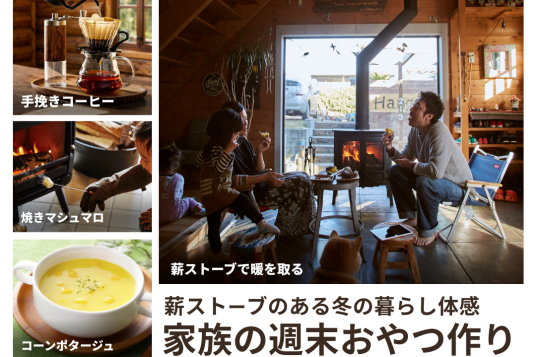 木の香りに包まれたログハウスで、薪ストーブを囲みながら過ごす、少し特別な週末。薪ストーブでじっくり煮込んだコーンポタージュや、焼きマシュマロ・手挽きコーヒーなど寒い冬にぴったりな体験を通して、家族でゆったり過ごす時間をご用意しました。